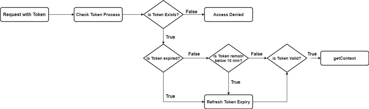 가장 보편적인 방식은 쿠키의 세션ID를 조회하여, 인증 정보를 조회하는 것이다. 하지만, 위에서 설명했듯이, 여러 플랫폼을 받아들이기 위해 Token Based Authentication 방식을 채택했다. 인증이 필요한 리소스 요청의 경우, Session이 아니라, 커스터마이징된 Token을 통해 인증 상태를 검증하는 로직이 필요하므로, 위의 플로우 차트와 같은 로직을 적용한 커스텀 필터를 구현하여, `SecurityFilterChain`에 포함하였다.