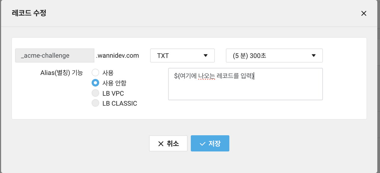 $ sudo certbot certonly --manual -d {도메인.com} -d *.{도메인.com} --preferred-challenges dns --key-type rsa