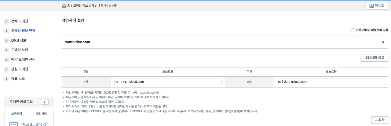 Global DNS에 도메인 등록이 완료되었으면, 가비아의 도메인 통합 관리툴에서 네임서버 변경을 진행하면 됩니다.